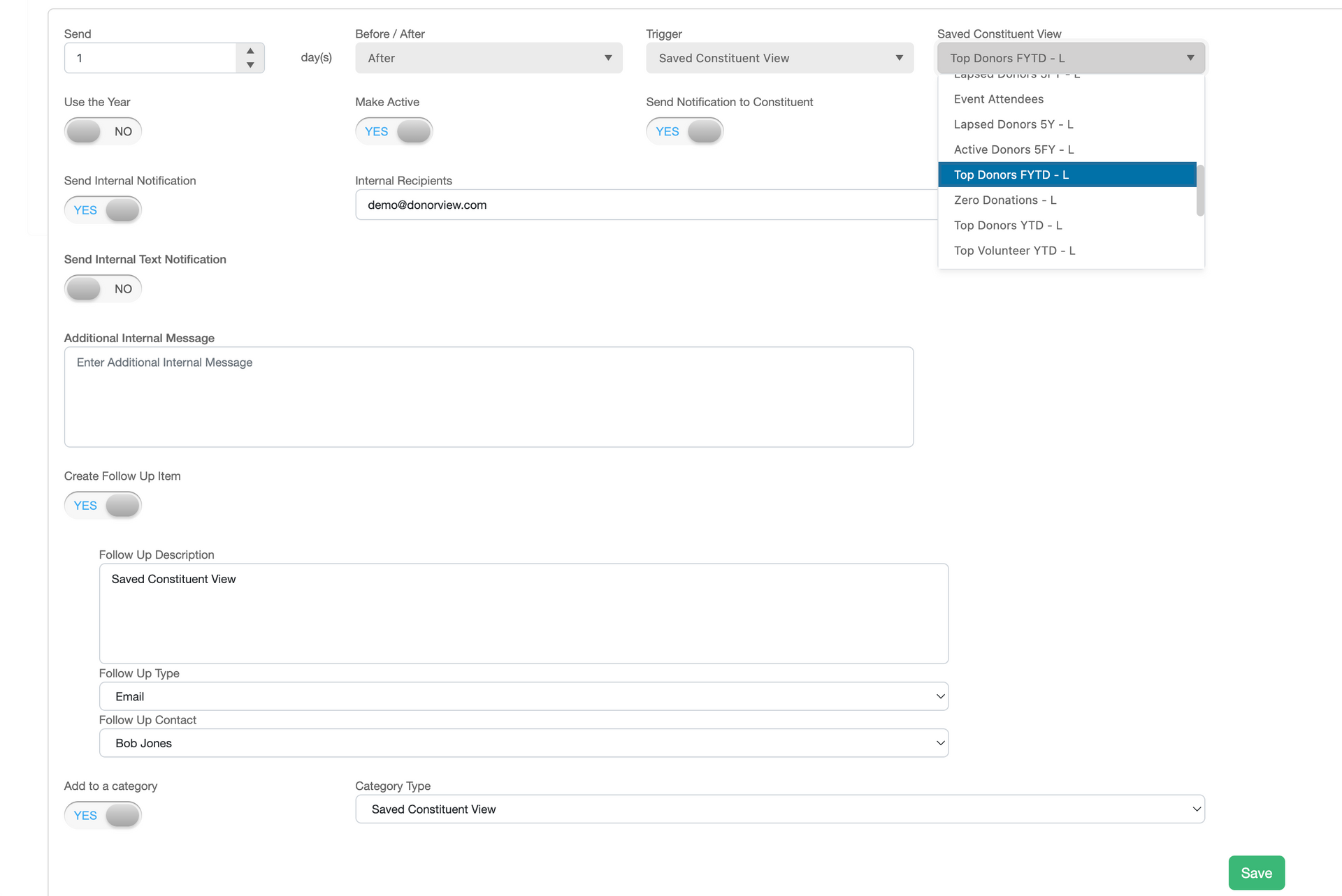 Send internal or external emails, deliver text messages, create follow-ups, and even assign constituent categories without manual effort. It’s a smarter, more dynamic way to engage and manage your data based on the exact filters that matter most to you.