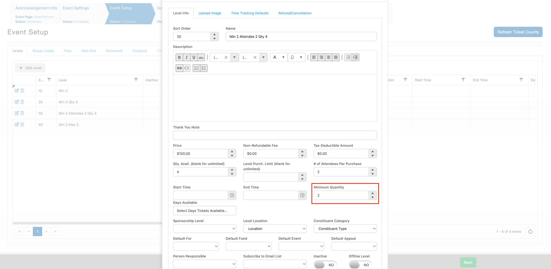 The minimum quantity is clearly displayed on each level, and if the remaining availability drops below that minimum, the level will automatically show as Sold Out. This helps you manage group-based registrations and capacity with greater accuracy and confidence.