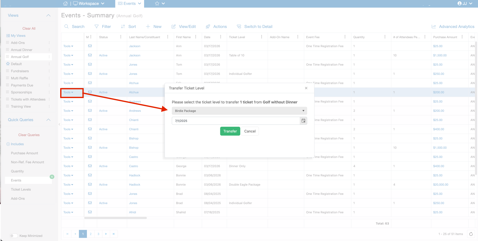 The ticket level assigned to an Event Purchase can now be modified to a different level within the same Event. On the main Events grid click the on grid Actions menu for the desired transaction and select “Transfer”. A dialog will launch where you will then be able to select which Event Level the transaction should be transferred to. The transfer will also impact the available quantity of both levels for your event. Increasing the available quantity of the level you are transferring away from and decreasing the available quantity of the level you are transferring to.