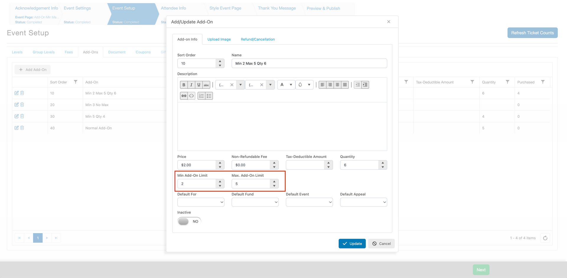 Event Add-Ons now come with greater flexibility and control. You can set both minimum and maximum quantity requirements for each add-on, ensuring registrants select the right amount every time.