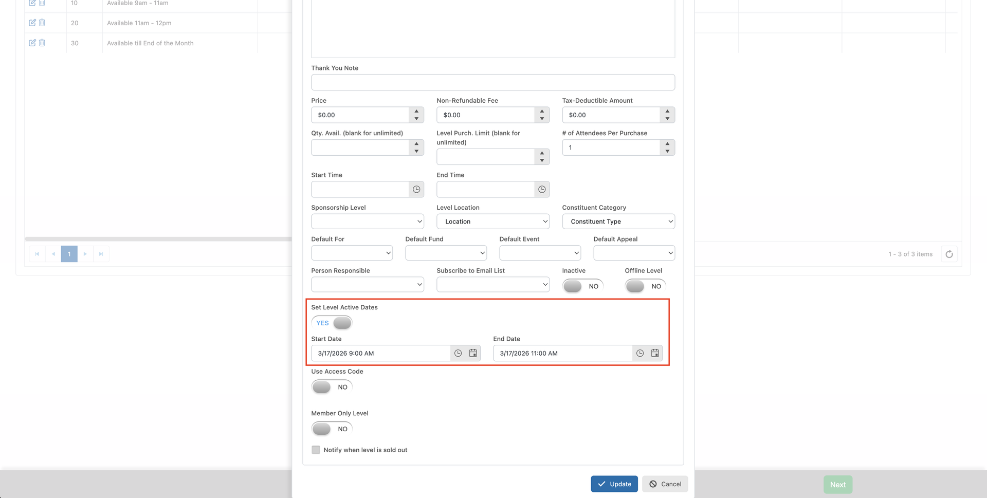You are now able to schedule when an Event Level will appear as active and available for registration or inactive and hidden on an Event Form. While setting up an Event Level turn on the Set Level Active Dates toggle setting and enter a date for both the Start and End.