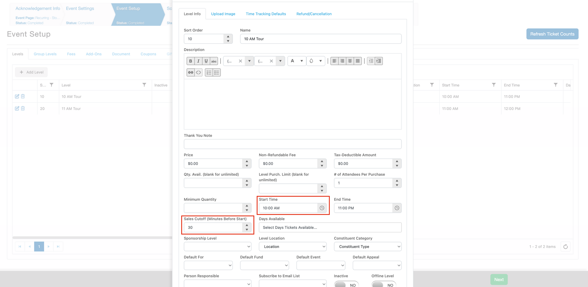 One-time event levels have been enhanced to give you precise control over registration timing. You can now set both the exact date and time when a level becomes available, as well as when it closes and is removed from your online Event form. This added flexibility makes it easier to manage timed releases, early access, and cutoff deadlines with complete accuracy.